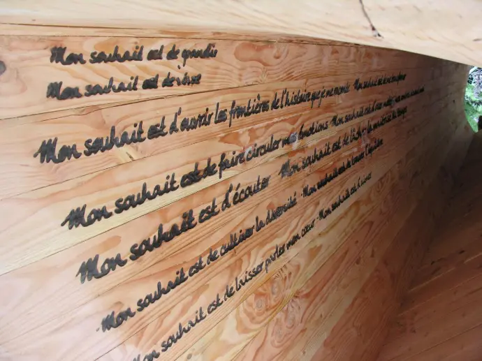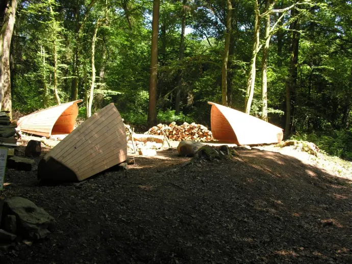 L'aire de Bivouac se situe juste à côté de l'abri artistique Trivouac. On peut y installer 4 tentes. Réservation obligatoire via le formulaire ci-dessous. Prenez soin de respecter les règles reprises sur le panneau installer à l'aire de bivouac. Les aires de bivouac sont uniquement destinées aux randonneurs en itinérance sur Sentiers d'Art. Attention, période de canicule, le feu est interdit sous toutes ses formes. Plus d'infos : https://environnement.wallonie.be/feux Dans l'abri Trivouac , il est possible de dormir à maximum 3 personnes (1 personne par "coque retournée ") C’est une coque en bois retournée. On pourrait penser à une barque retournée, mais l’objet est monolithique, sculpté d’une seule pièce, pour faire transparaitre un mouvement, un élan.La forme en ogive est privilégiée pour une question d’espace et pour sa dimension sacrée. Elle se veut inspirante et de reliance entre le bas, notre chaire, le moi de chacun, notre terre, et le haut, le cosmique, l’UN. A la frontière entre sculpture, land art et (espace) fonction(nel).Le texte sacré gravé dans chacune des cahutes, invite à l’éveil des âmes. La forme des objets en longueur invite au repos et la pause…. des cocons de bois. Cette oeuvre a été réalisée en 2017 par Alexandre Rossignon (Belgique)