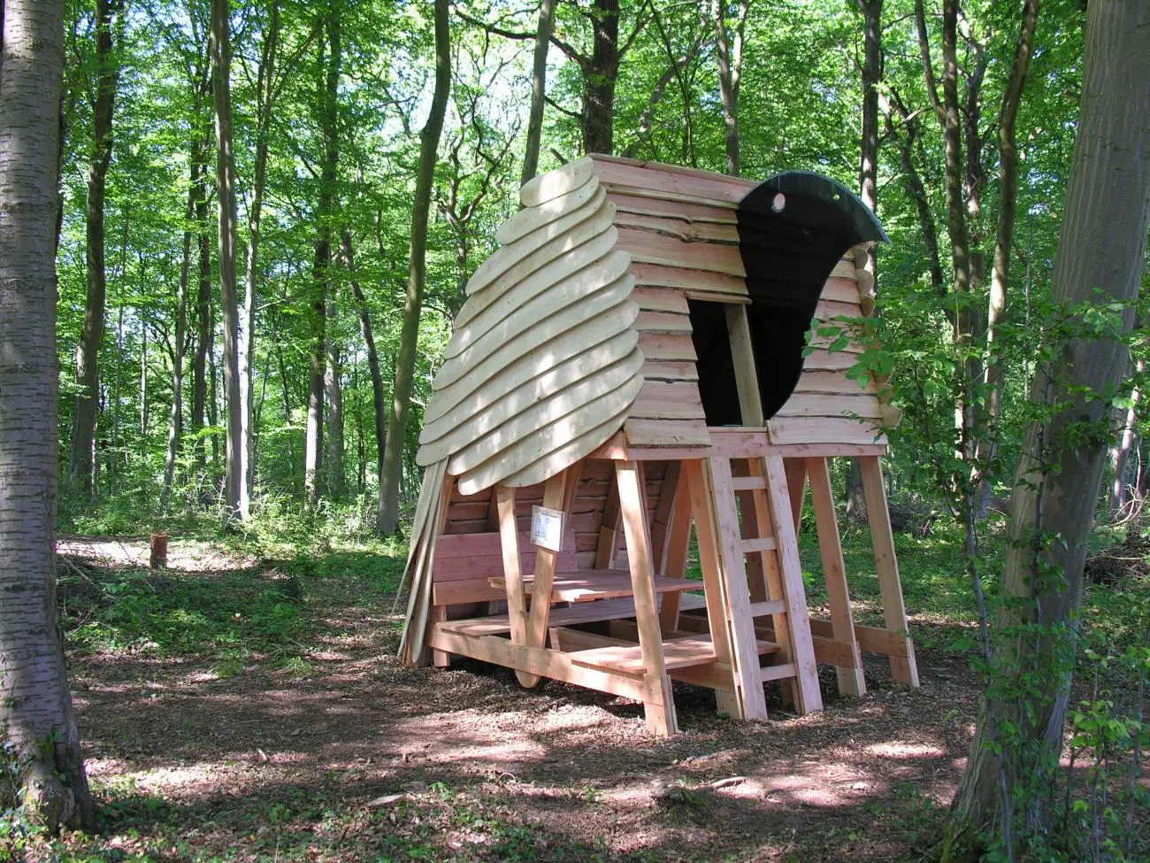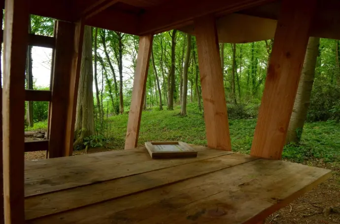 L'aire de Bivouac de Haltinne "Sous son aile" vous permet d'installer 4 tentes maximum. La réservation est obligatoire via le formulaire ci-dessous. Les aires de bivouac sont uniquement destinées aux randonneurs en itinérance sur Sentiers d'Art. L'abri artistique "sous son aile" est installé juste à côté. Attention, période de canicule, le feu est interdit sous toutes ses formes. Plus d'infos : https://environnement.wallonie.be/feux Qui n’a pas rêvé de se blottir ou se reposer sous l’aile d’un bel oiseau protecteur ? Un refuge protégé sous l’aile du volatile. (sans préciser lequel…) Il s’agit d’un petit coin repas, avec bancs et table au rez-de-chaussée, permettant de s’y restaurer à l’abri de la pluie et à l’étage une plate-forme permettant le couchage.. Une œuvre réalisée en 2017 par Christian Lagrange (Belgique) Dans l'abri, il est possible de dormir à 2 personnes- pas de réservation possible- premier arrivé, premier servi. Prenez soin de respecter les règles reprises sur le panneau situé à l'aire de bivouac.