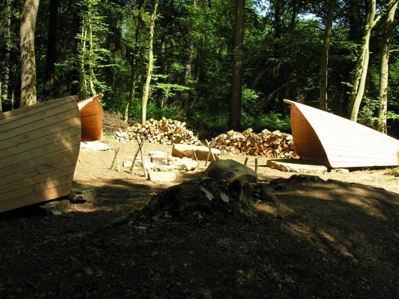 C’est une coque en bois retournée. On pourrait penser à une barque retournée, mais l’objet est monolithique, sculpté d’une seule pièce, pour faire transparaitre un mouvement, un élan.