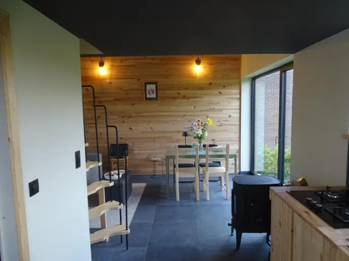 Bienvenue Au Temps de Pierre, Un gite écologique au calme et dans un très beau cadre. Un bain nordique au feu de bois en fonctionnement pour la saison hivernale (sera peut-être mis en fonction en été) Il dispose d'une superficie de 35 m2 avec lit en mezzanine d'1m80. Cuisine équipée de taques au gaz, frigo, Air Fryer, bouilloire, et d'une presse à café. Salon avec une petite TV pour regarder des DVD mise à disposition. Ainsi que des livres et jeux de société. Salle de bain avec cabine de douche, WC, évier et une penderie. Table et chaises de jardin, ainsi qu'un coin jardin sont à votre disposition. La région est prisée pour les balades, les sentiers d'art, le château d'Haltinne...