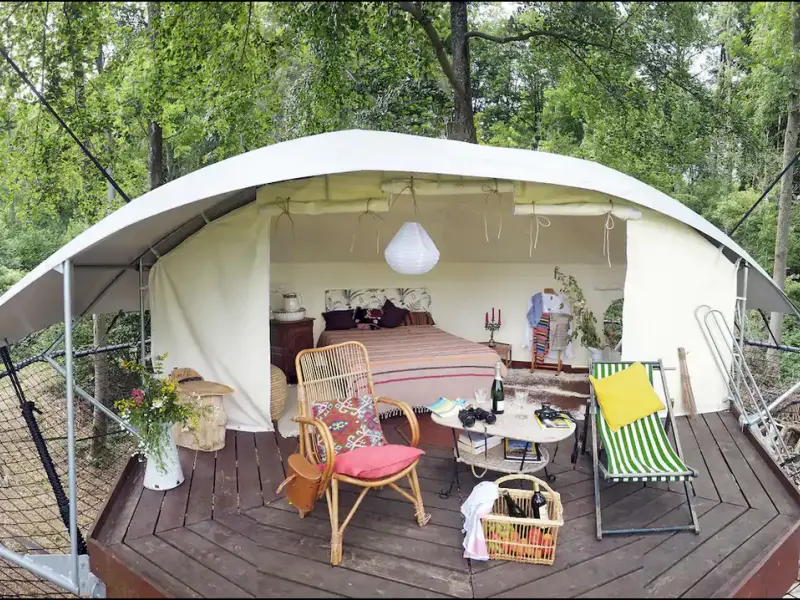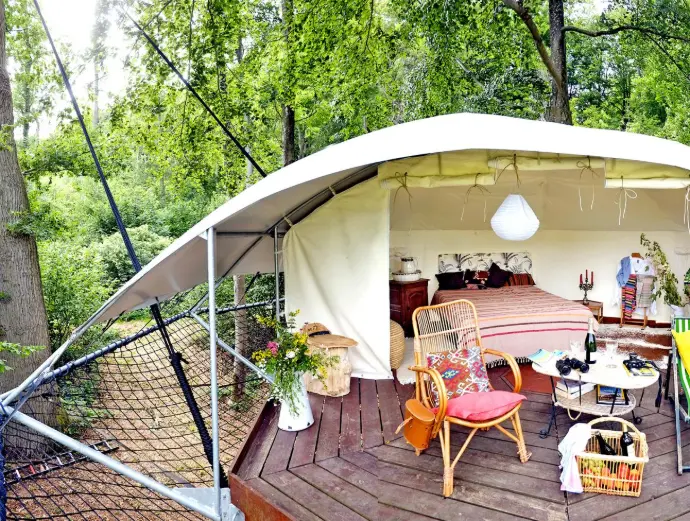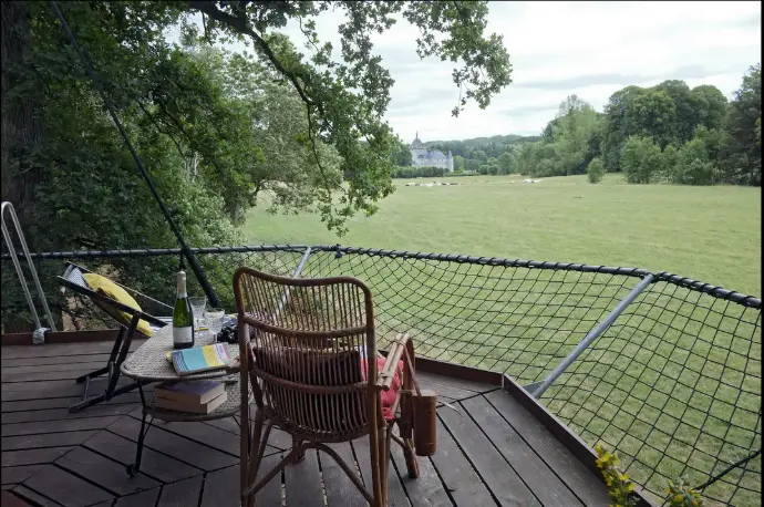 La Dom’Up est une plateforme perchée dans les arbres, accrochée à deux énormes chênes multi-centenaires, surmontée d’une tente spacieuse pouvant accueillir deux personnes. Le tout dans un écrin de verdure du parc d’un des plus beaux château de la région, Hodoumont, l’environnement étant classé site exceptionnel de Wallonie. 2 pers. + 2pers en tente 165€/nuit en semaine (sauf juillet-août) 140€/nuit pour deux nuits et plus 195€/nuit de week-end et juillet-août 165€/nuit pour deux nuits et plus Plus de deux personnes : 25€/nuit par pers. supp Draps et petit-déjeuner inclus