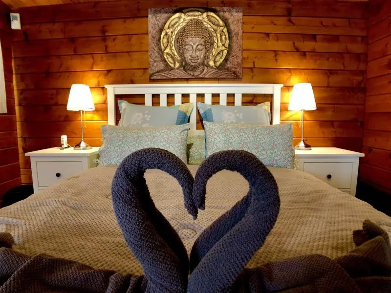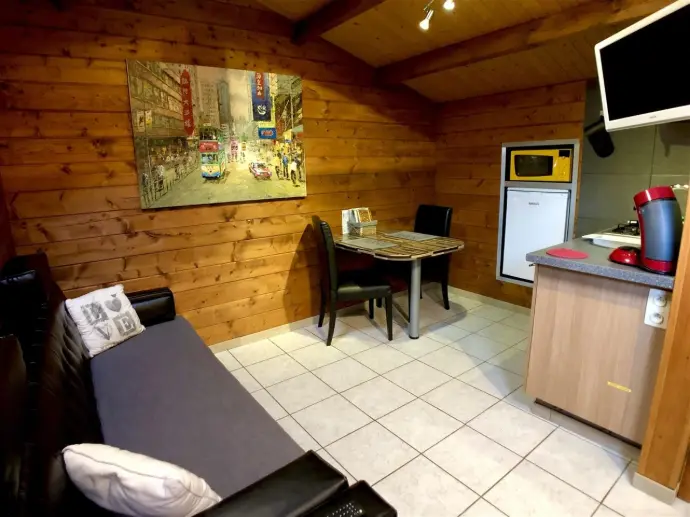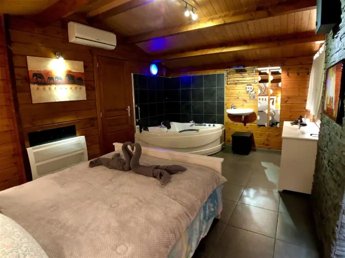 Un chalet dans une propriété entièrement privative et fermé. Chambre deux personnes avec Smart TV, Jacuzzi, cuisine équipée, terrasse, bassin de jardin,... Possibilité de réserver vos petits déjeunes, plateau apéro-bulles 125€ à 150€/2 pers.
