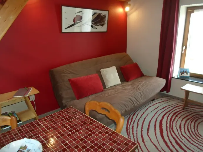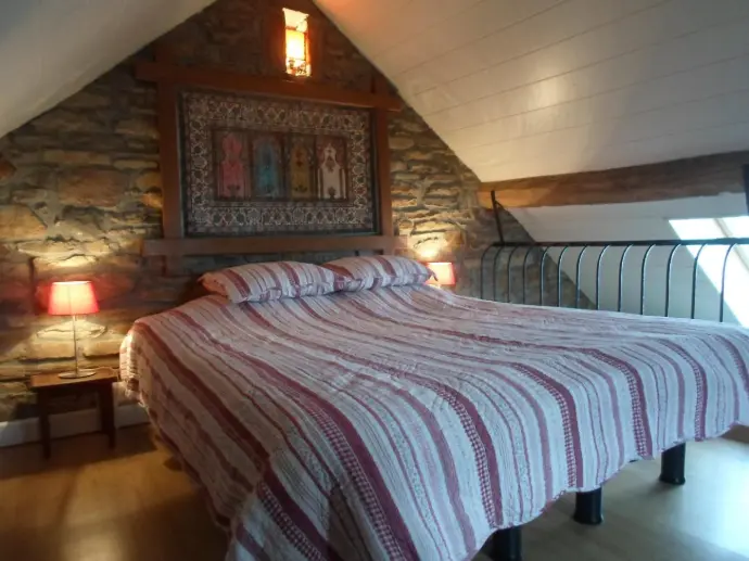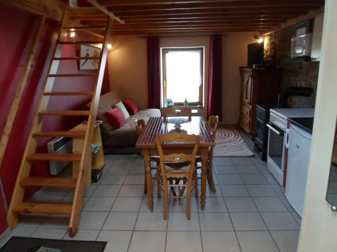 Capacité: 2 à 4 personnes Composition: Gîte mitoyen à la maison des propriétaires, bâtiment en pierre du pays en zone rurale. R.-de-ch.: superficie de 28m², un coin cuisine et un coin salon composé d'un canapé convertible pour deux personnes ainsi que d'un canapé convertible pour une personne. Une salle de bain avec douche et un wc séparé. 1er étage : une mezzanine avec un lit de deux personnes. Extérieur : Vaste terrain arboré avec pelouse, barbecue et mobilier de jardin.